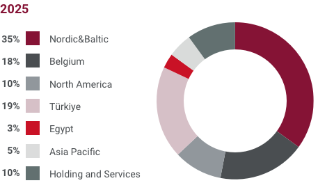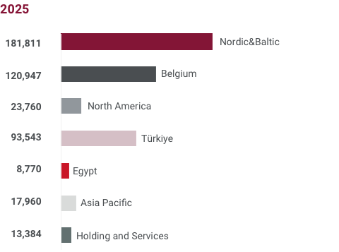 (Non-GAAP)Change % Nordic & Baltic 181,811 173,716 4.7% Belgium1 120,947 93,942 28.7% North America 23,760 24,774 -4.1% Türkiye2 93,543 78,999 18.4% Egypt 8,770 16,874 -48.0% Asia Pacific 17,960 21,240 -15.4% Holding and Services3 13,384 (10,289) -230.1% Total EBITDA 460,175 399,256 15.3% 1Includes non-recurring income of EUR 17 million in 2025.