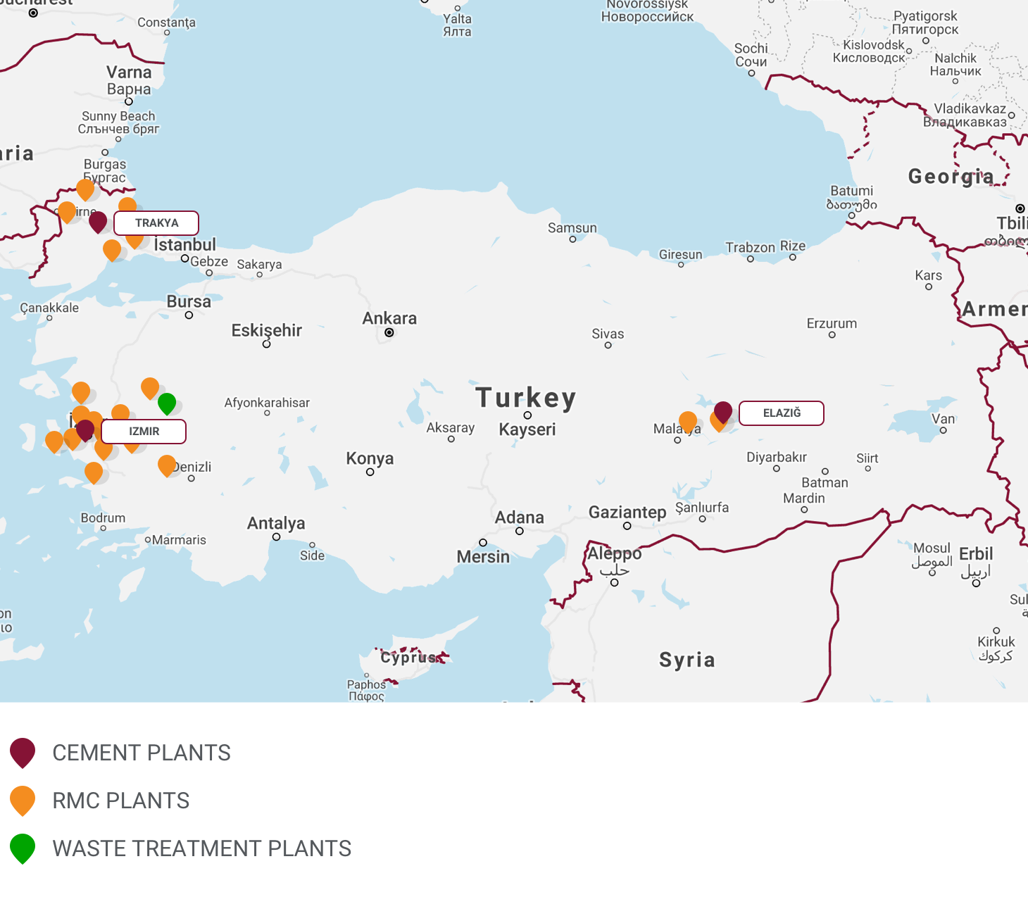 The subsidiary Çimbeton, also listed on the Istanbul Stock Exchange since 1977, is the main ready-mix concrete production company in the Aegean region, with 23 concrete plants located mainly in the western part of Türkiye and the Eastern Anatolia region.